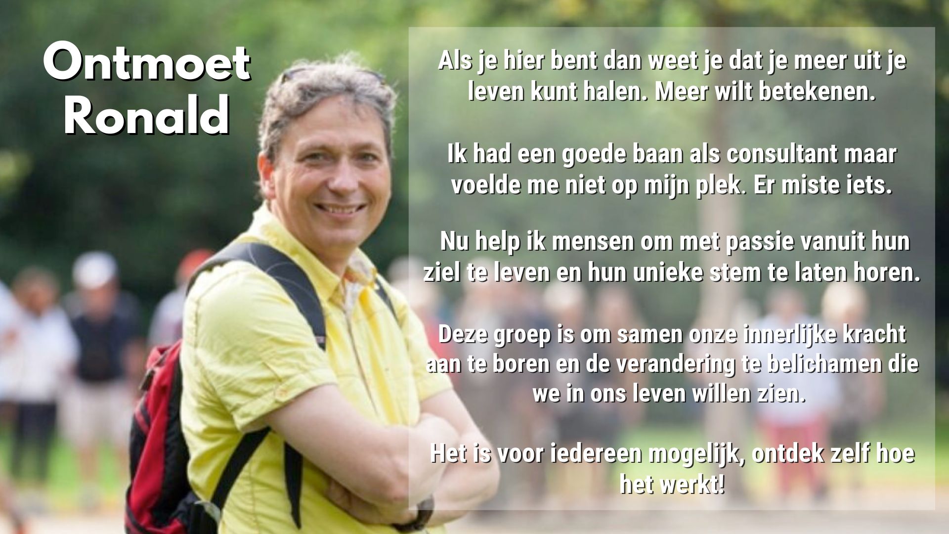 Gevoelige en betrokken mensen die het verschil willen maken, kiezen Ronald als coach om een nieuwe start te maken en een leven vol passie, kracht en moeiteloosheid te leiden.